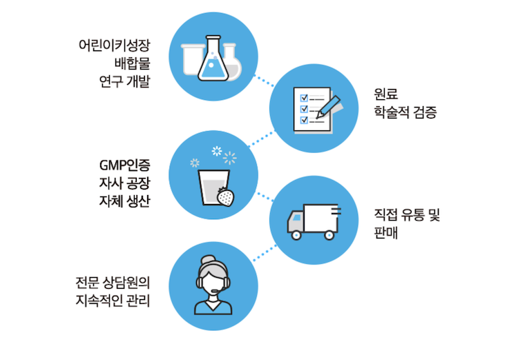 헬스케어 기업인 종근당 건강이 직접 연구와 제조, 판매까지 하고 있습니다. 우리 아이들이 먹기 때문에 철저히 연구하고 더욱 까다롭게 검증하여 만들었다고 합니다. 8단계의 원료공정, 26단계의 제조 및 품질관리를 통해 믿고 먹을 수 있는 기능성건강원료입니다.