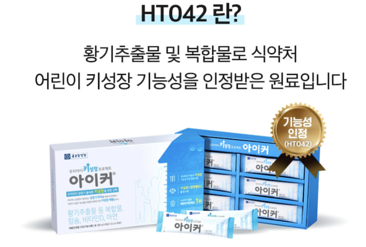 아이커에는 국내 최초로 식약처에서 인정한 어린이 키성장 기능성 원료인 황기추출물 및 복합물(HT042)가 함유되어 있습니다. 황기에서 추출한 복합물의 인체시험 내용을 보니, 12주 후 어린이 신장이 증가한 걸 확인할 수 있었습니다. 7-12세 어린이 대상으로는 2.25cm 가 섭취군 성장치이고, 1.92cm가 비섭취군 평균 키였습니다. 약 0.33cm의 차이를 볼 수 있습니다. 시중에 아이들의 키가 커진다는 기능성 식품이 종류가 꽤 있습니다. 반드시 식약처에서 인증한 상품인지 한 번 확인해 보셔야 할 것 같습니다.