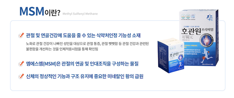 그럼 어떤 호관원에는 어떤 성분이 있는지 한 번 알아볼까요? 호관원 프리미엄의 핵심 성분으로는 MSM이라 불리는 식이유황 1500mg과 해조칼슘 270mg이 들어 있습니다. 먼저 MSM은 관절기능에 효과가 있는 성분으로 식약처에서 기능성을 인정받았습니다. 연구에서 12주 이상의 꾸준한 MSM 섭취가 관절 통증 및 관절 건강에 도움을 주었다는 결과가 나왔습니다. 한두번 먹어서는 그런 효과가 나지 않고 어느 정도 꾸준한 시간을 들여야 된다는 말입니다. 운동 후 염증과 산화 스트레스를 줄여줌으로써 이러한 효과가 생긴다고 합니다.