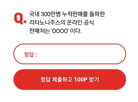 내용: 1일 오전 10시 출제된 문제는 국내 300만병 누적판매를 돌파한 리타노니주스의 온라인 공식 판매처는 OOOO이다이며, 문장 속 ○○○○에 들어갈 단어를 맞추면 된다. 총 2천만 원의 상금이 걸린 이번 퀴즈의 정답은...