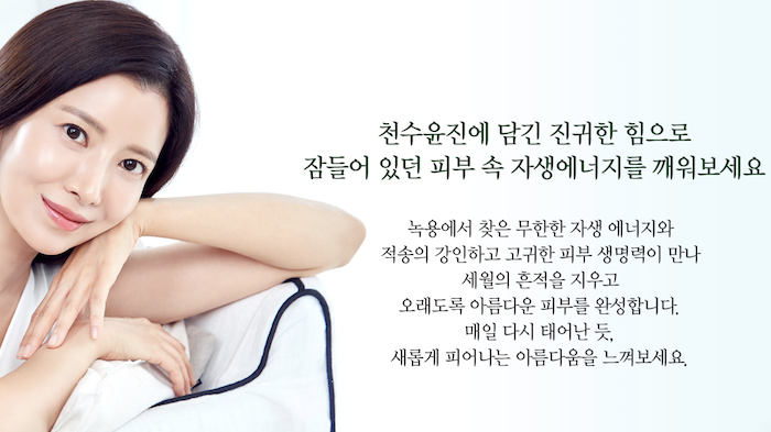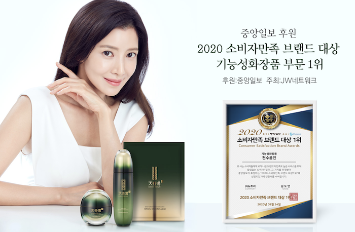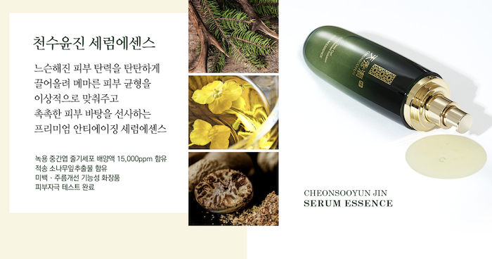 천수 윤진은 인체 적용 시험을 통해 입증 된 노화 방지 효과가 있으며, 소비자 만족도 조사 결과 수분, 부드러움, 발림성 및 흡수성, 감촉 등에서 매우 높은 결과를 보였다고한다. 사용하다. 주름 개선, 탄력 개선, 잡티 개선 분야에서 가장 주목 받고있다.