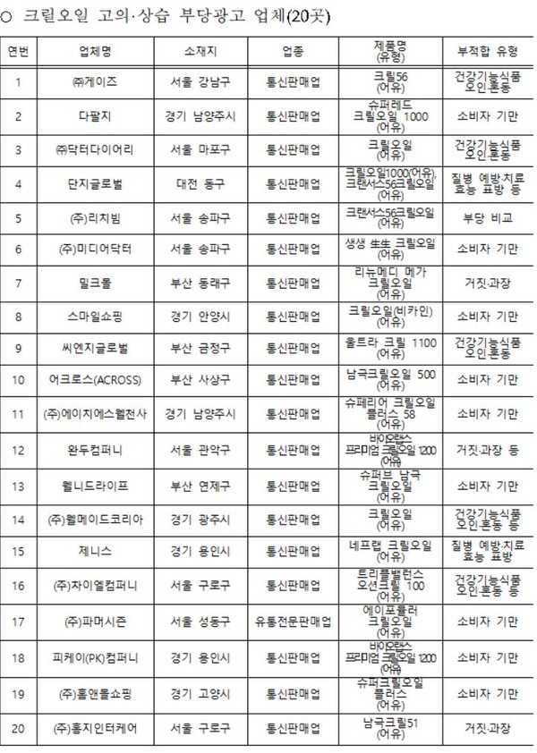 내용: 소비자들이 관심이 많은 크릴오일, 콜라겐 제품의 허위 과장 광고가 많은 것으로 나타났다.... 식약처는 올해 상반기 부적합 제품을 분석해 소비자를 속여 부당이익을 취하거나 위반사항을 시정하지 않고 반복적으로 위반한...