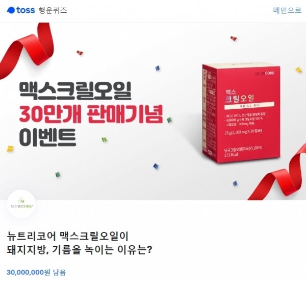 사진=토스 홈페이지 캡처 뉴트리코어 맥스크릴오일 효능이 관심을 끌고 있다. 7일 토스 퀴즈에 뉴트리코어 맥스크릴오일 관련 키워드가 등장해 화제다. 뉴트리코어 맥스크릴오일은 다이어터들에게 각광받는 제품이다. 체내에서...